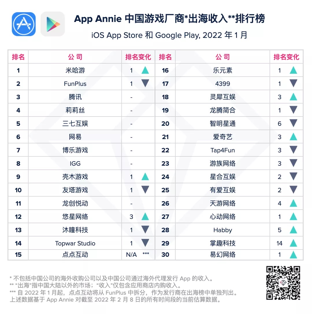 移动数据和剖析公司 App Annie 发布了 2022 年 1 月我国游戏厂商及使用出海收入 30 强榜单。以下是陈述首要内容: