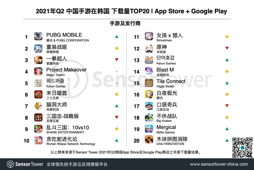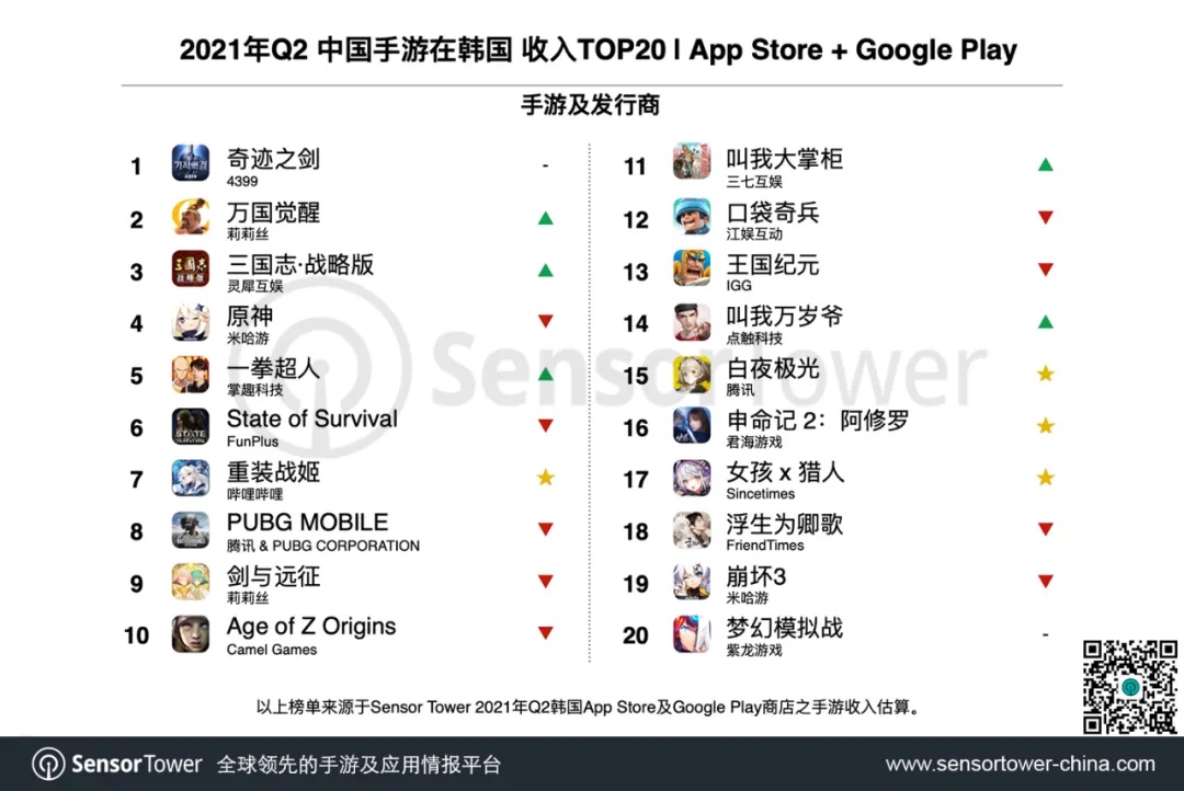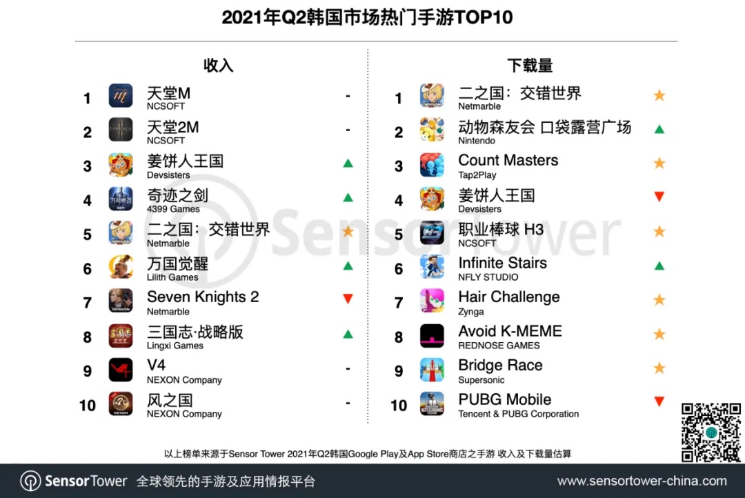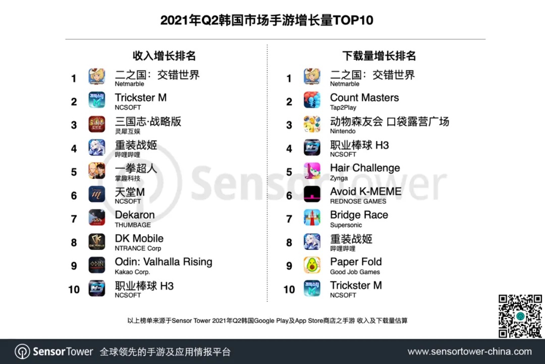 2021 Q2 韩国手游市场报告:总收入同比增长 20% 至 13.7 亿美元,6 款中国手游入围畅销榜 Top 20