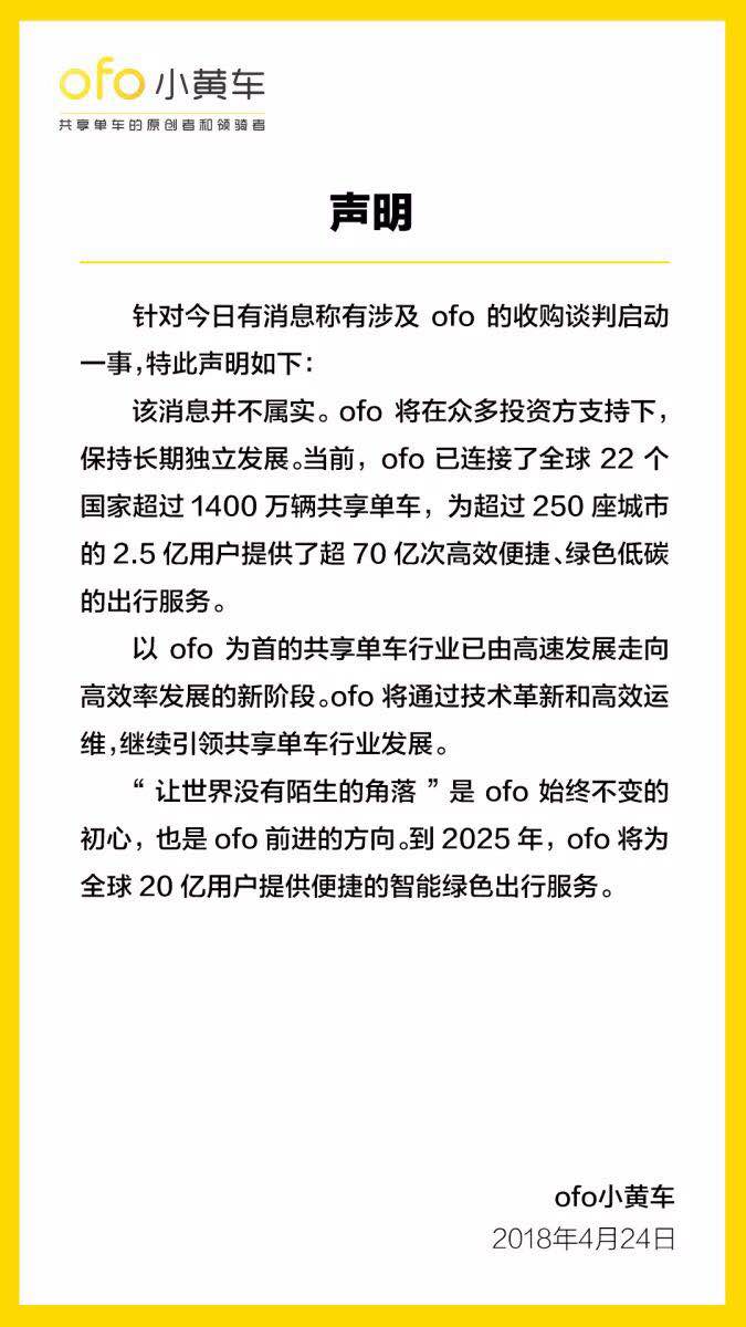 4月24日音讯,针对近来有音讯称有触及ofo的收买商洽发动一事,ofo今天下午宣告声明否定,表明”该音讯并不事实。ofo将在很多投资方支持下,坚持长时间独立开展。”