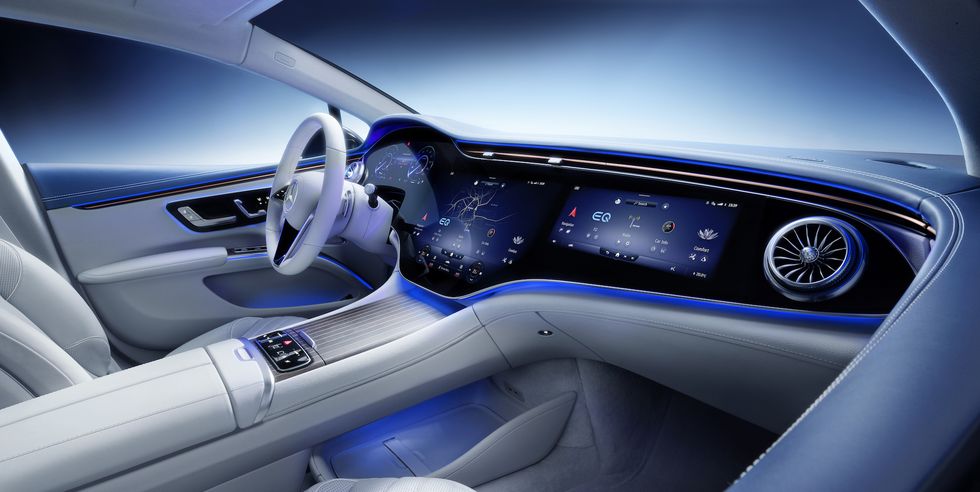 梅赛德斯-奔驰的Hyperscreen 使一切其他轿车显示器看起来就像一个幼儿园项目。包含EQS SUV在内的 EQ 车型可用,横跨整个外表板的 56 英寸玻璃包含三个独立的屏幕:一个 12.3 英寸的外表板、一个 12.3 英寸的乘客接触屏和一个 17.7 英寸的中心接触屏。操作 Hyperscreen 和与之相连的电动轿车,相当于驾驭台式游戏 PC。